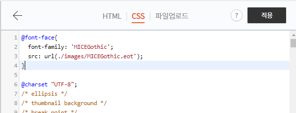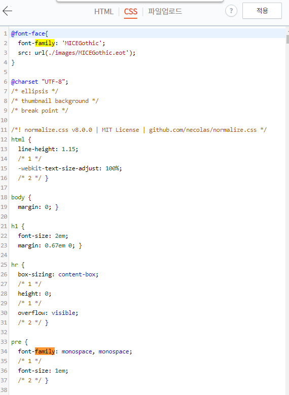 5. Ctrl키와 F키를 같이 눌러 font-family 를 검색한 후 찾아서 폰트명(ex.MICEGothic)을 추가하고 상단의 적용을 누른다.